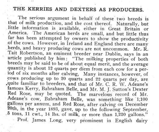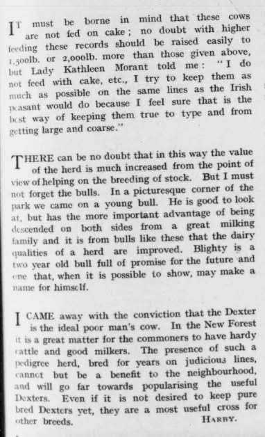 “Naturally in these times, when the economy of feeding stock is of importance, the hardiness of a Dexter, the large milk given by them on a small quantity of food, and their ability to thrive on poor pastures make them particularly attractive”