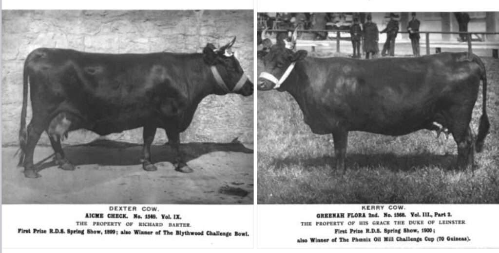Many may not know that the Dexter at one time was known to have milking properties of equal merit as the Kerry, a known dairy breed, though they are a dual-purpose breed. Mr. R Tait Robertson was to of said ” The milking properties of both breeds may be said to be of about equal merit”. Who is R. Tait Robertson? He is the son of James Robertson, of whom bred or collected a large portion of the foundation Dexters sold to England and other places. He was an influential breeder. For an interesting photo reference of the amazing similarities of Dexter and Kerry cattle see Aicme Check (Dexter cow) and Greenah Florah 2nd (Kerry cow). I did not have to hunt far and wide to find examples that looked closely related. All I had to do is go to the 1901 Herd book and find the only available photos of an example Kerry and Dexter cow. And by the way note the classic white Dexter udder marking on the Kerry cow as this was a common Kerry trait feature too. Nose to nose as you can see in the photo comparison they do look quite alike.