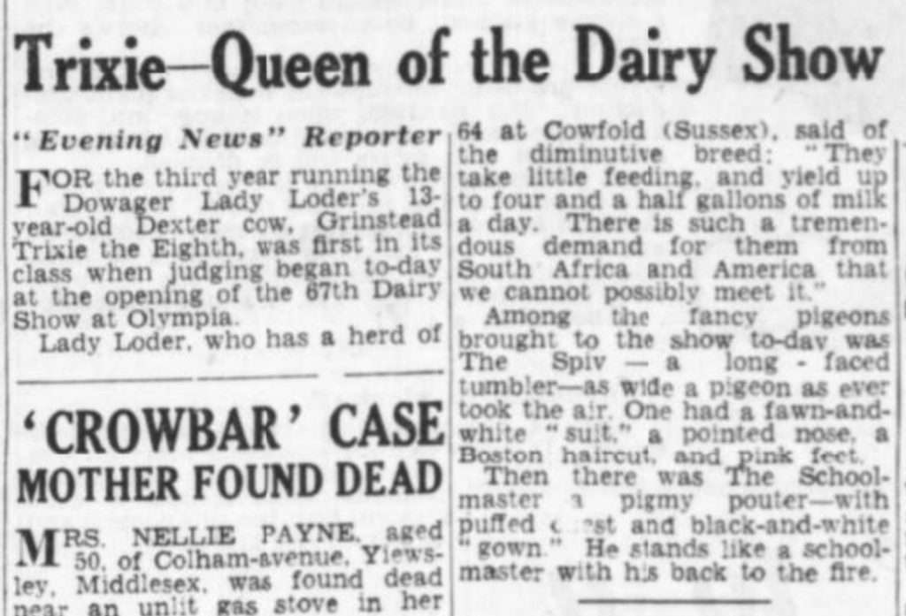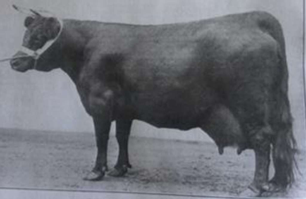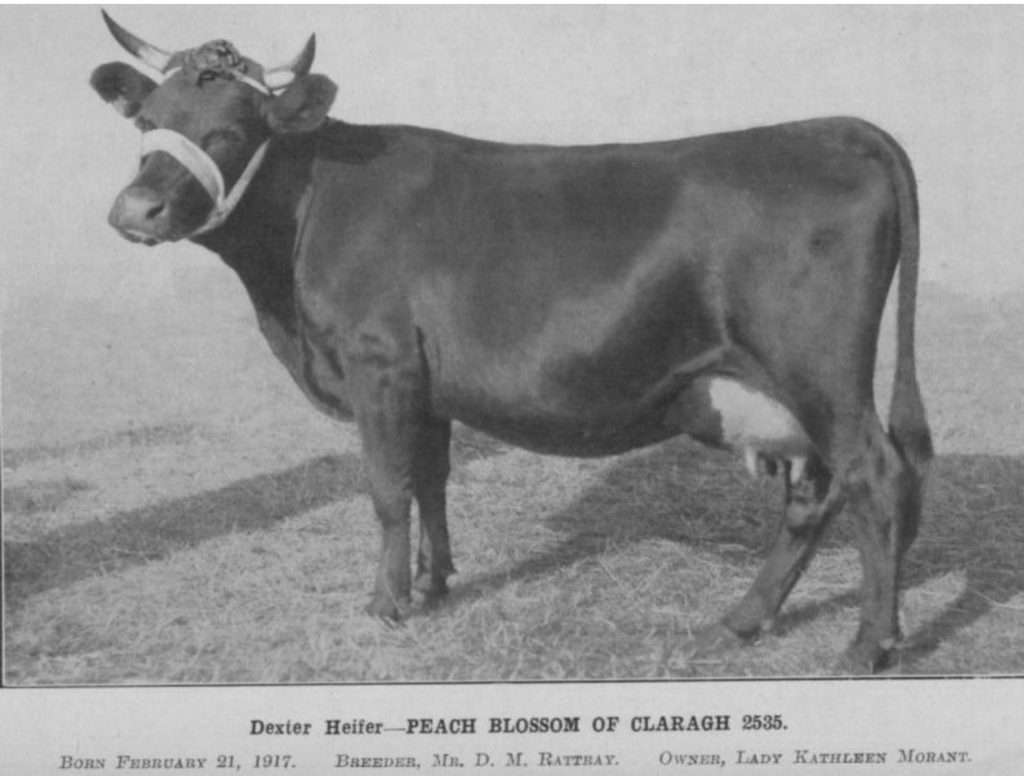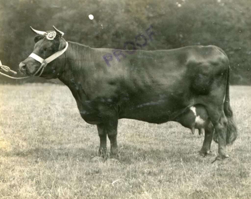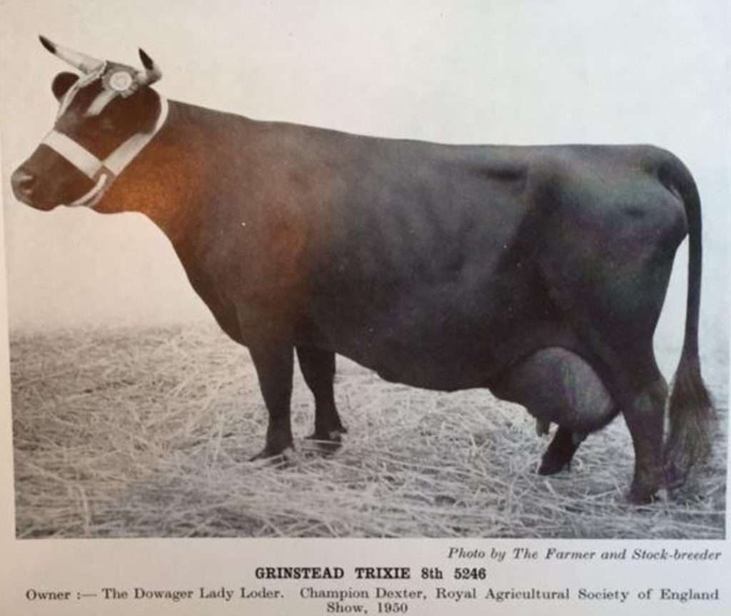 This is Grinstead Trixie the 8th. Lady Loder the breeder, was known for only selecting sires out of cows with proven milking records. Though this cow may seem like she has less than perfect attachment at 10 years old(the age in photo), she looks to have a good amount of volume. You will see in the article above, Trixie is “Queen of the Dairy Show” in October 1953 (then 13 years old and winning first prize for 3 running years). She was a top Dexter cow out of cows that were milking at 4 and a half gallons of milk a day. Lady Loder was known to cull hard and keep to a high standard. Trixie the 8th could have had improved udder attachment, but she definitely filled her part as a solid milk cow. Now I shall dig a bit further back in history to give the reader a greater understanding. Let us next consider Grinstead Trixie the second and likewise the original Trixie herself.