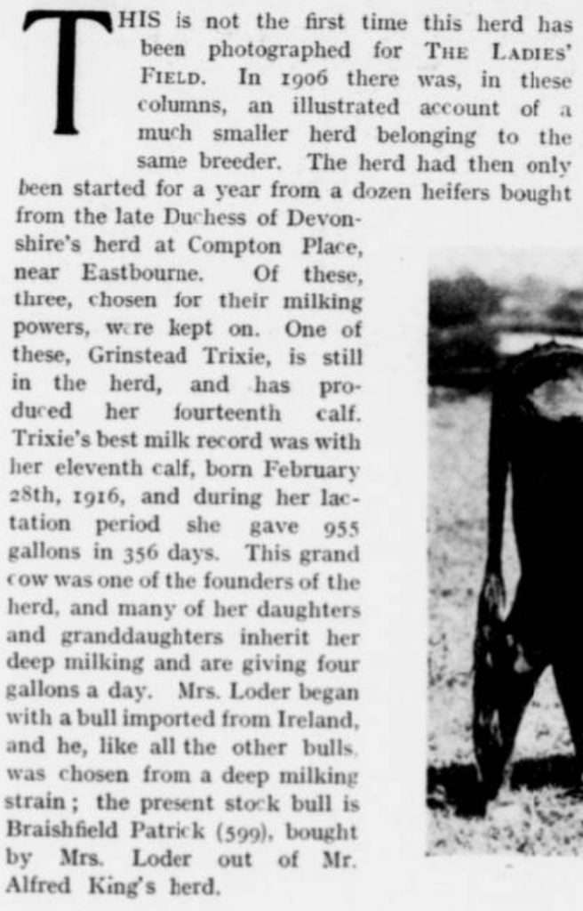 Just to give a very interesting historical compass to the full impact of the Grinstead Trixie line, let us delve deep into history, back to November 1919 when the original Trixie was being written about. The original Trixie was one of an original 12 cows that were obtained by Lady Lodger. Of those original cows she only kept three, Trixie being one of three top cows. Those 3 cows were chosen for their milking powers. Trixie was born in 1904 and was a foundation cow for the Royal Dublin Society. By 1919 she had produced her 14th calf, proving to be productive and already fairly long lived. What an exceptional cow to start your herd from. This cow was the foundation of Lady Loders Grinstead herd and imprinted her name on the herd for generations to come. Lady Loder in other statements had complained about some of the low quality Dexters that were being sold. Lady Loder may not have started with the best stock, but she culled down to just three cows to build her herd from and only used proven bulls that possessed dairy traits worth passing on to their offspring. She had a focused eye that considered the breed standard when evaluating and considering her Dexters by. Her legacy is one worth being remembered and replicated, showing you do not need much to start out with, but rather have a quest for quality and be willing to cull to obtain it.
