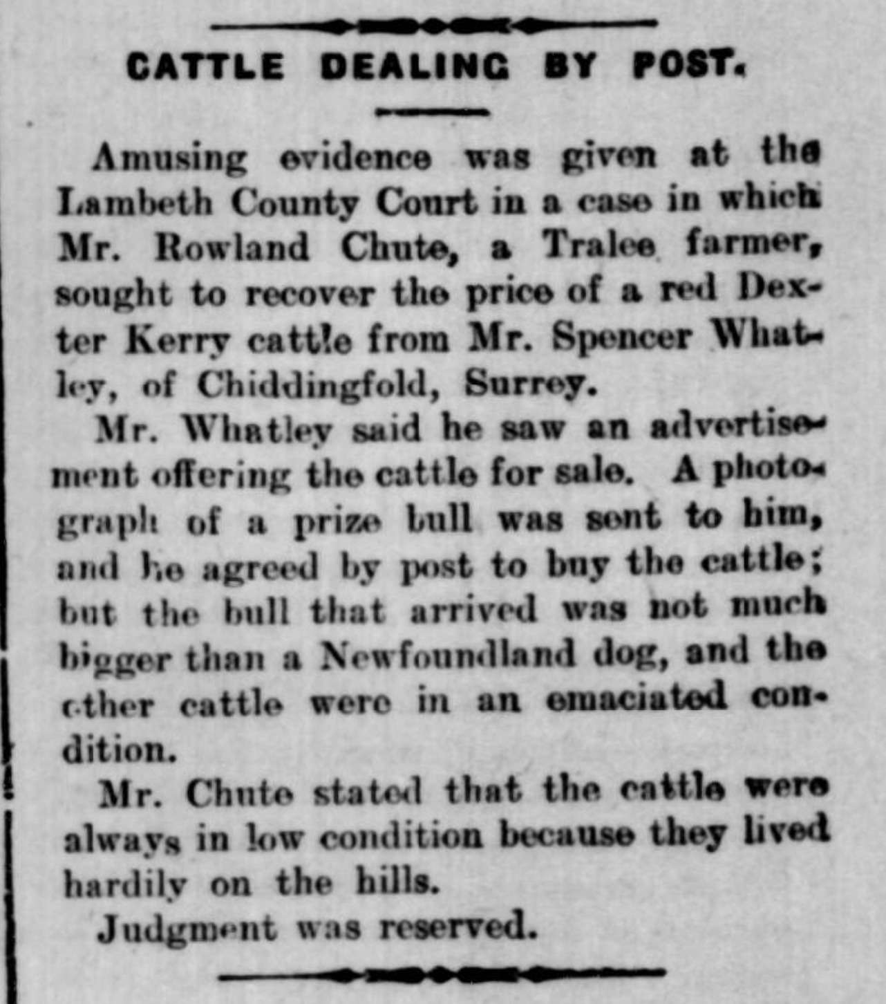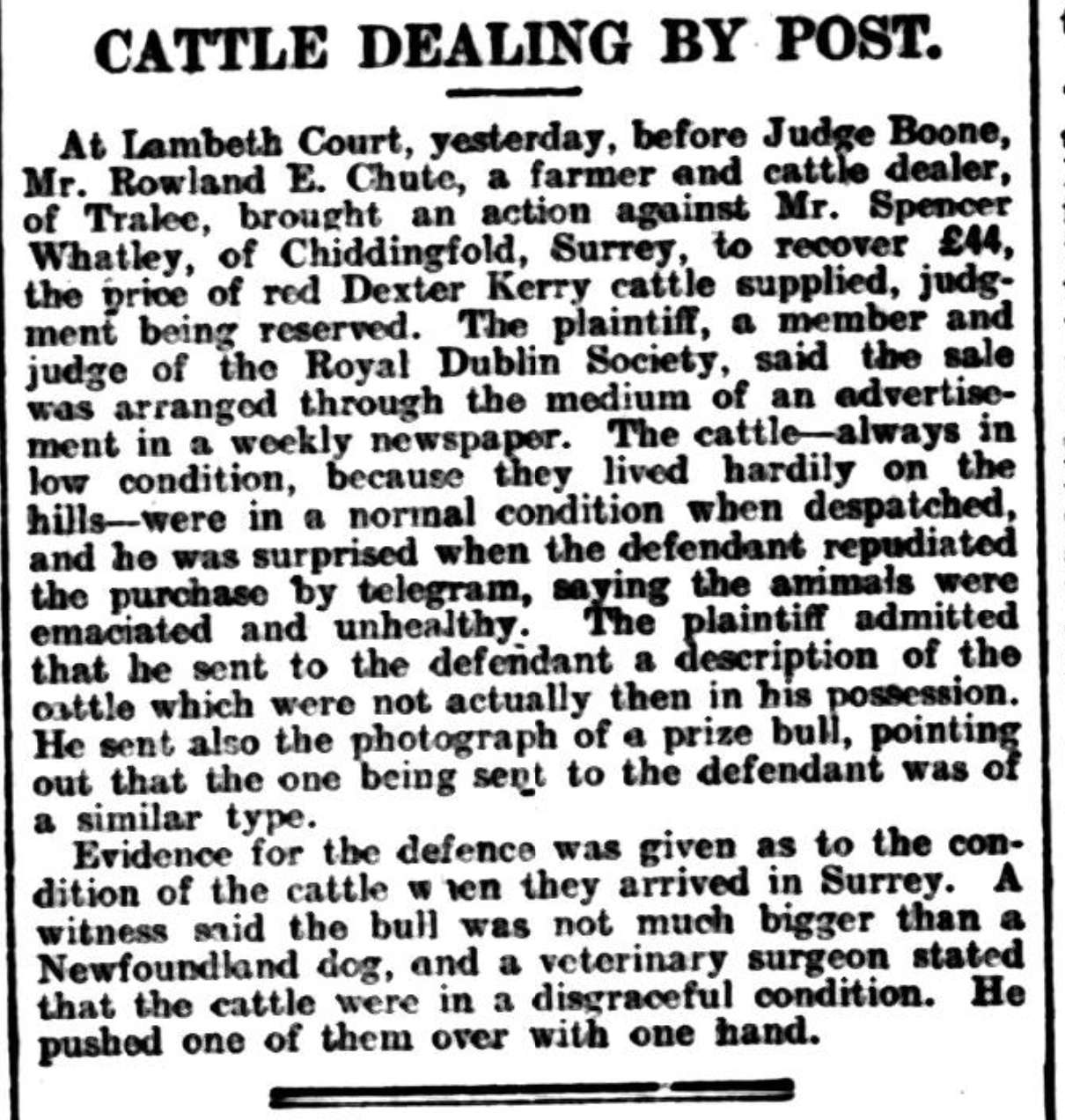 Chute claimed his Dexters were in “normal condition” because the cattle were “always in low condition, because they lived hardily on the hills”. Chute was surprised to hear the animals were emaciated and unhealthy but then admitted that he sent a description of cattle that were not actually in his possession. Instead, he sent a photograph of a prize bull! It does cause the mind to wonder where these animals may have been obtained from, just wondering the hills waiting to be snatched at the moment a perspective buyer was found. Witnesses definitely backed up the claim of the poor condition of the Dexters. Most importantly a veterinarian said that they were in disgraceful condition. Those are strong words; he did not just say they were in low condition but disgraceful! The bull was not much bigger than a Newfoundland dog. A male Newfoundland dog may weigh as much as 150 pounds and stand at 28inches tall. To consider the size of a Newfoundland dog see the story here where a Newfoundland Dog and a little Shetland Pony similar in size “have struck up an unlikely friendship”. https://www.chroniclelive.co.uk/news/north-east-news/newfoundland-dog-forms-unlikely-friendship-21682333