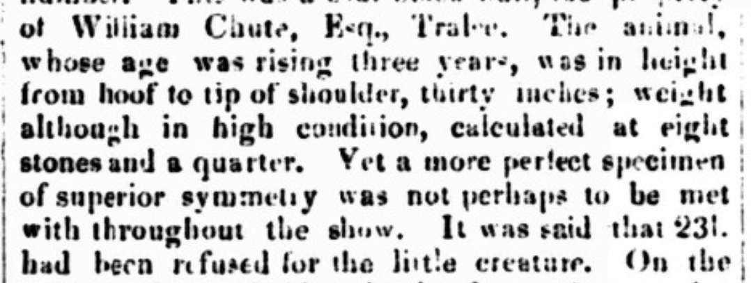 Here we will see the significance of Rowland Chute in my historical wanderings of Dexter cattle. Rowland Chute sent a photograph of a prize-winning bull (I wish had that photograph) to a prospective buyer, Mr. Spencer to help persuade him into buying his cattle. I tried to research and find information on what bull this could have been but turned up no results when looking for a Leebrook (Chute’s herd name) bull, so I must assume that the bull was of a different registered herd name. It sounds as though Chute may have sent a picture of a prize-winning bull and the buyer may have purchased stock thinking they would resemble the bull in the photograph. What the buyer received was in no wise up to his expectations but rather “not much bigger than a Newfoundland dog, and the other cattle were in an emaciated condition”. Chute’s response was “that the cattle were always in low condition because they lived hardily on the hills”.