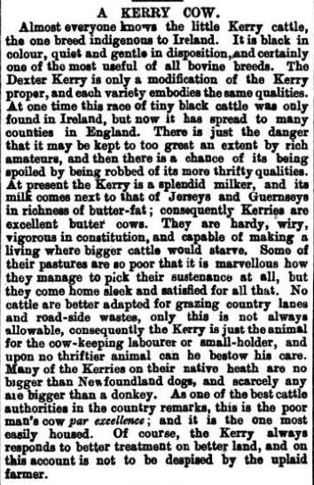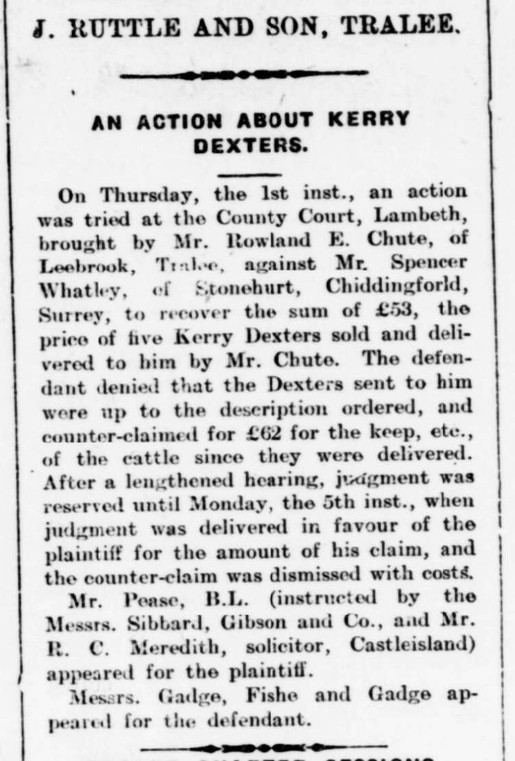 In this article Rowland Chute, the plaintiff was requesting £53 to recover the cost of the Kerry Dexters sold to Mr. Spencer Whatley. Mr. Watley countered that Chute should pay 62 £ for the keep of the unfit cattle upon their arrival since they were delivered. The County Court, Lambeth delivered in favor to Chute awarding him his claim of £53 and dismissing the counter claim from Mr. Watley. Mr. Rowland Chute was vindicated that day of his charges, but a further look into the Herd books shows that Rowland Chute had a very limited future with Dexters. When I searched for records, I found only 3 registered cows with the prefix Leebrook. Leebrook Cush, Leebrook Darkie and Leebrook Stella. All of these three cows were owned and bred by Rowland E. Chute and Qualified by inspection. If I were to guess they were possibly inspected by Mr. Chute himself since he was a judge for the Royal Dublin Society. None of these cows show any offspring that I can find. One cow’s date of birth is listed as 1898, the other listed as Dec 11, 1898 and the last Dec 20 1898. I later found Chute appointed an officer for the “Kerry and Dexter Cattle Society of Ireland” in 1917 written in the Kerry Evening Post. For a man who was so involved with Dexters, appointed a judge and an officer, he has a very small number of Dexters registered to his name and you can’t but wonder if his cattle that were once said to be “in a disgraceful condition” had something to do with why. If a breeder wants to stay long in breeding any form of life one must attend to its needs and we must never give hardiness as an excuse for a true form of neglect. I will not develop any conclusive opinion on Mr. Chute as there were some incredibly small Dexters in Ireland, as I said before partially due to genetics and diet. Chute was said to have had a bull that weighed 8 stones and a quarter (115.5 pounds). The 3-year-old bull measuring at 30 inches from hoof to tip of shoulder was said to be in high condition. The comment was made in reference to this bull, “Yet a more perfect specimen of superior symmetry was not perhaps to be met with throughout the show.” This bull I will wager was the prize bull that was previously mentioned. It is fair to say that most Dexter owners will want a Dexter to fatten out at a larger weight than 115 pounds, live weight and if properly taken care of you may nearly guarantee today, whatever type of Dexter you raise, they will by 3 years old.