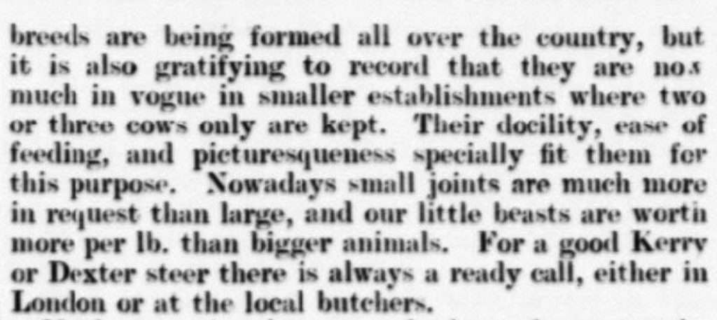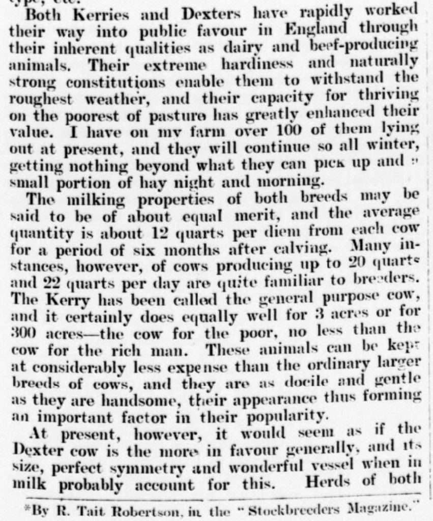 Mr. Roberston was a very influential breeder, breeding in Malahide, County Dublin, Ireland. His family later had Church Farm in Babraham, Cambridge. His Dexters were esteemed as quality and were very sought after by the English who wished to keep them. He is the son of James Robertson. They were not just multigenerational farmers but multi-generational Dexter farmers who helped shape Dexters in their early years by breeding and selection. Dexters as we know them then owed a great degree of tribute to this influential family. Mr. R. Tait Robertson was also a judge for Kerry and Dexter cattle. He judged them by the merit that this article speaks to. Someone may say that Dexters are a beef breed that can milk, but Mr. R Tait Robertson said they have “equal merit” to Kerry cattle. They were not transformed in England to a milking breed but rather selected and bred by breeders like the Robertsons for great dual-purpose traits and were heavy in exceptional dairy traits. When R. Tait Robertson speaks to their equal merit remember that he was a judge for both Kerry and Dexter cattle and those judges gave prizes and entered both Kerry and Dexter cattle into the foundation herd books for the Royal Dublin Society. Dexters are not, nor have they ever been a beef breed that can be milked, but rather a dual-purpose breed with equal merit in milking traits to an ancient breed of dairy cattle (Kerry cattle) that can excel at grass-based feeding.