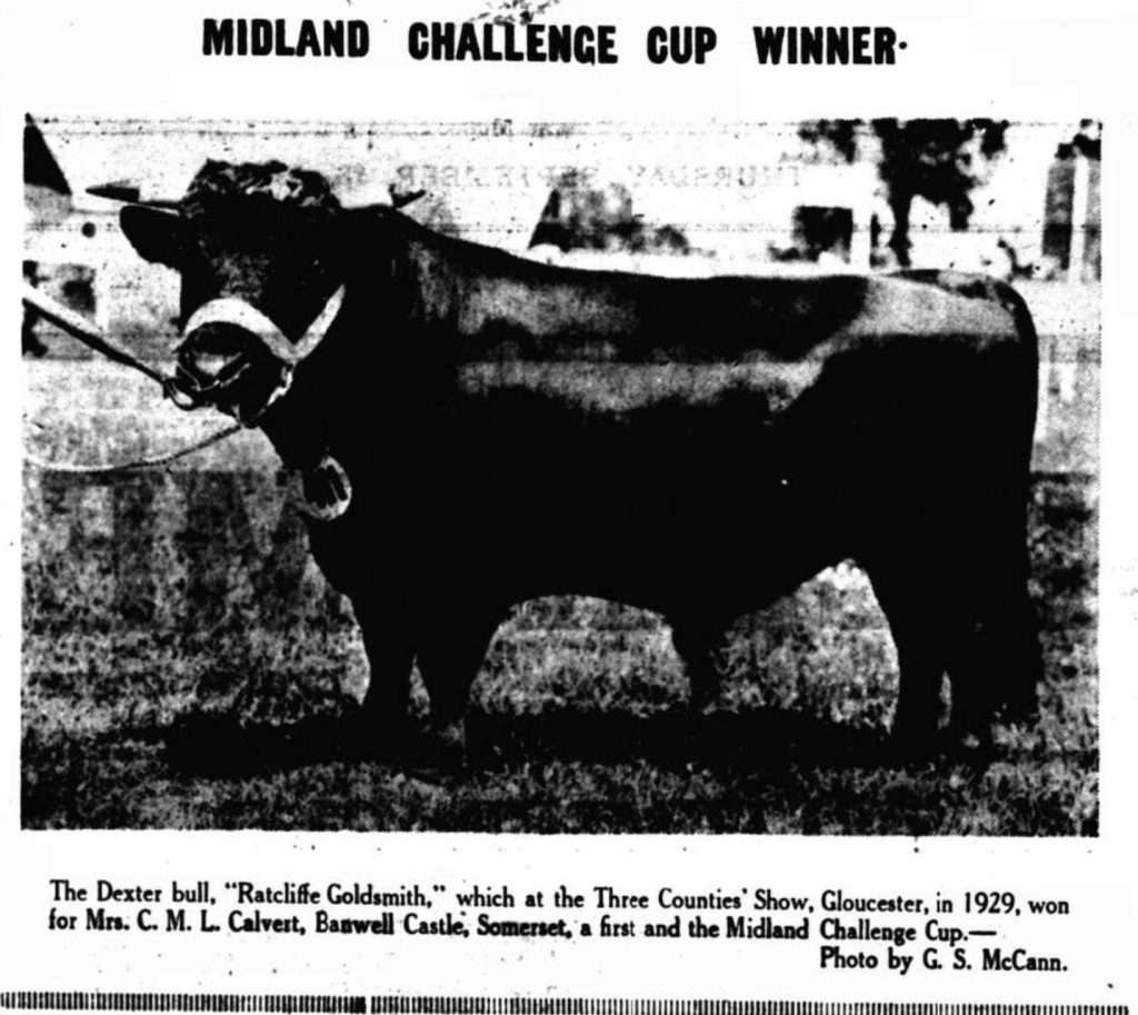 Dexters are well known as Irish Dexters even if many other points about them are debated. The above bull though registered with the Dexter Cattle Society is an Irish Dexter with a “fine type and constitution” as the article states. I checked, he certainly was owned and breed by Mr. W. Lindsay Everard of Ratcliffe. This article holds true to the fact that Dexters are known to be of a small type of cattle. That very small cattle were known to roam Ireland before “Mr. Dexter” was ever penned in History. In Kerry there was known to be some of the smallest type of cattle one can imagine, long before Dexters were ever established or organized into a true breed. So small of an animal that it is mentioned in this paragraph, but yet still producing 2 gallons of milk a day is a marvel indeed. The brown article was written on 14 Nov 1929, it’s from the Western Daily Press Bristol. The picture was taken from a later newspaper published in 1930. Though the Dexter was well known to produce ample milk and was “closely allied to the Kerry breed and very similar to it in general appearance.” The differences being that “Dexters are “more stoutly built and rounder in their contours”.